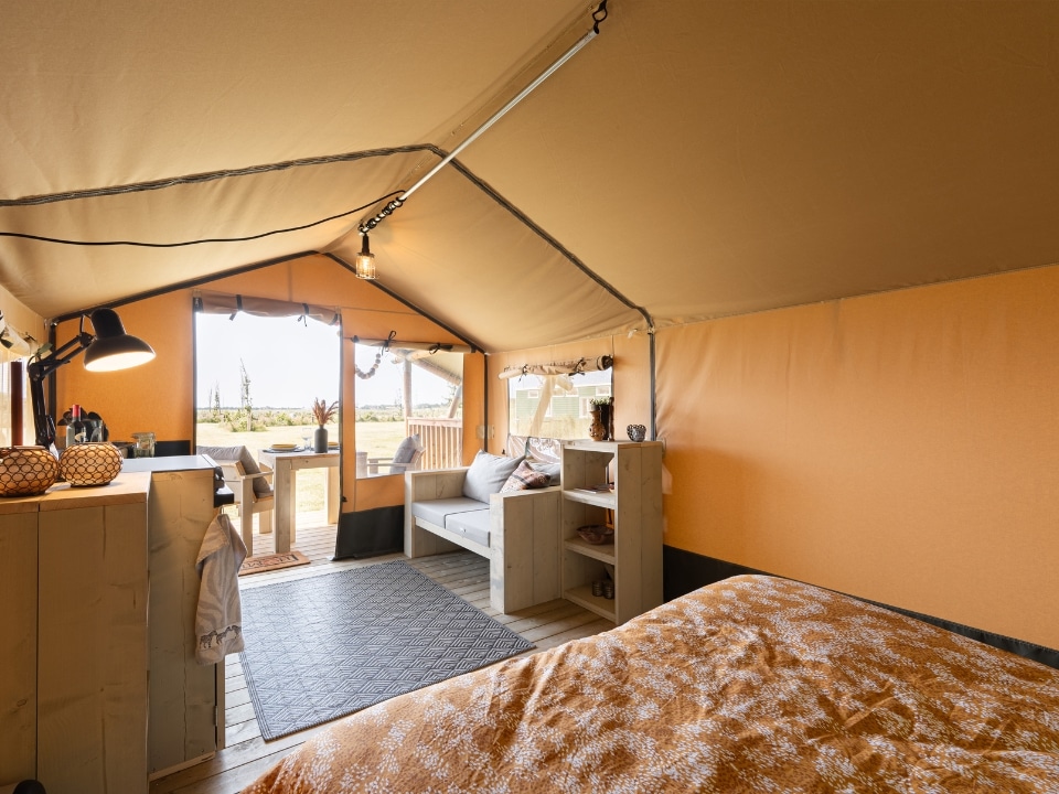 Von der Größe her liegt dieses Zelt genau zwischen dem Safarizelt Compact und dem XS. Das Fellow wurde aufgrund der Nachfrage nach einem kleinen Modell für schmalere Stellplätze mit zusätzlichem Wohnraum entwickelt. Das Fellow kann auch mit einem Wohnzimmer, einer Küche und/oder sanitären Einrichtungen ausgestattet werden. Neben einem geräumigen Schlafbereich ist das Safarizelt mit einer großen überdachten Terrasse vor dem Zelt ausgestattet. So können Ihre Urlaubsgäste die schönen Sommerabende im Freien genießen.
